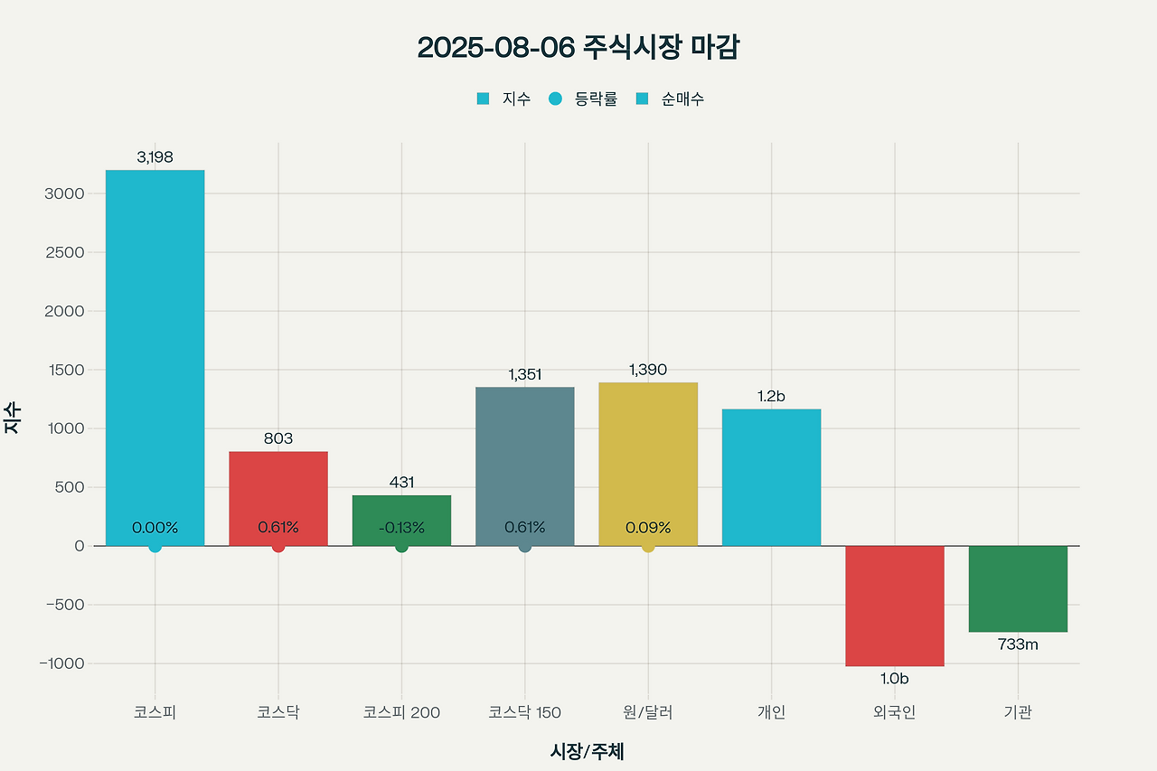 2025년 8월 6일 국내 주식시장은 트럼프 대통령의 관세 우려 속에서도 혼조세를 나타내며 코스피는 보합 마감, 코스닥은 800선을 회복했습니다123.