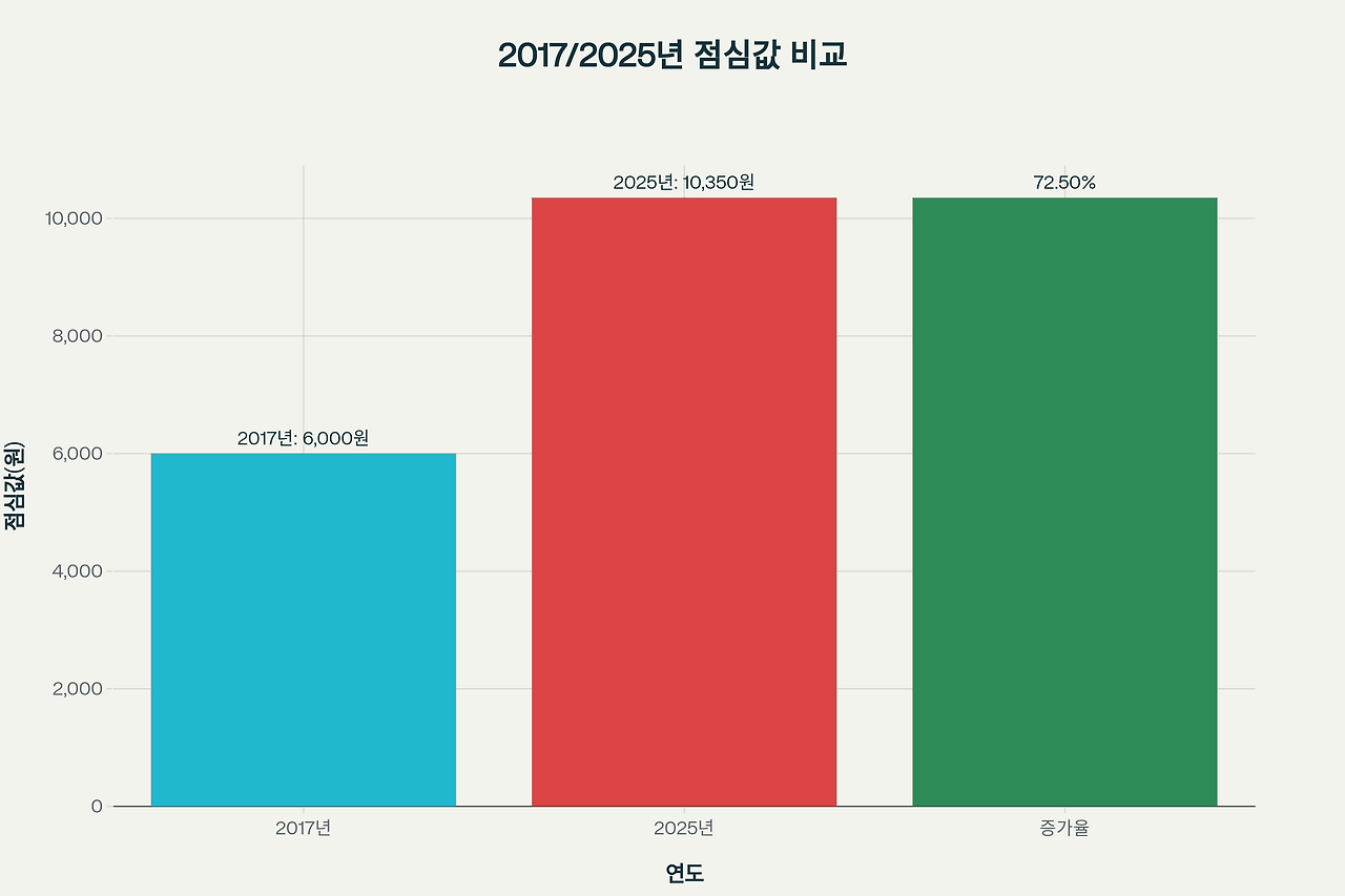 2025년 상반기 기준 수도권 직장인 평균 점심값은 9,500원으로 8년 만에 58% 상승했습니다. 이는 전체 소비자물가 상승률(16%)보다 1.5배 빠른 속도입니다.