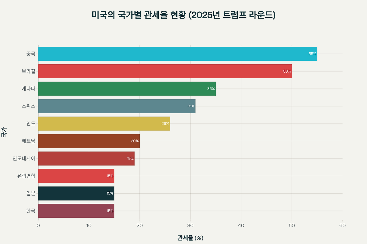 위 차트에서 보듯이, 미국은 중국에 압도적으로 높은 55% 관세를 부과하는 반면, 한국을 포함한 동맹국들에는 15% 수준의 관세를 적용하고 있다. 이는 '당근과 채찍' 전략의 전형적인 모습이다.