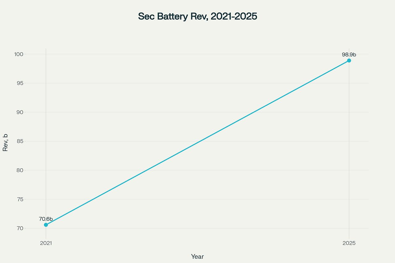 글로벌 2차전지 시장은 2021년 706억 달러에서 2025년 989억 달러까지 연평균 8.8%의 성장률이 전망됩니다. 전기차, ESS, 소형전자의 수요 확대가 주요 동력입니다.