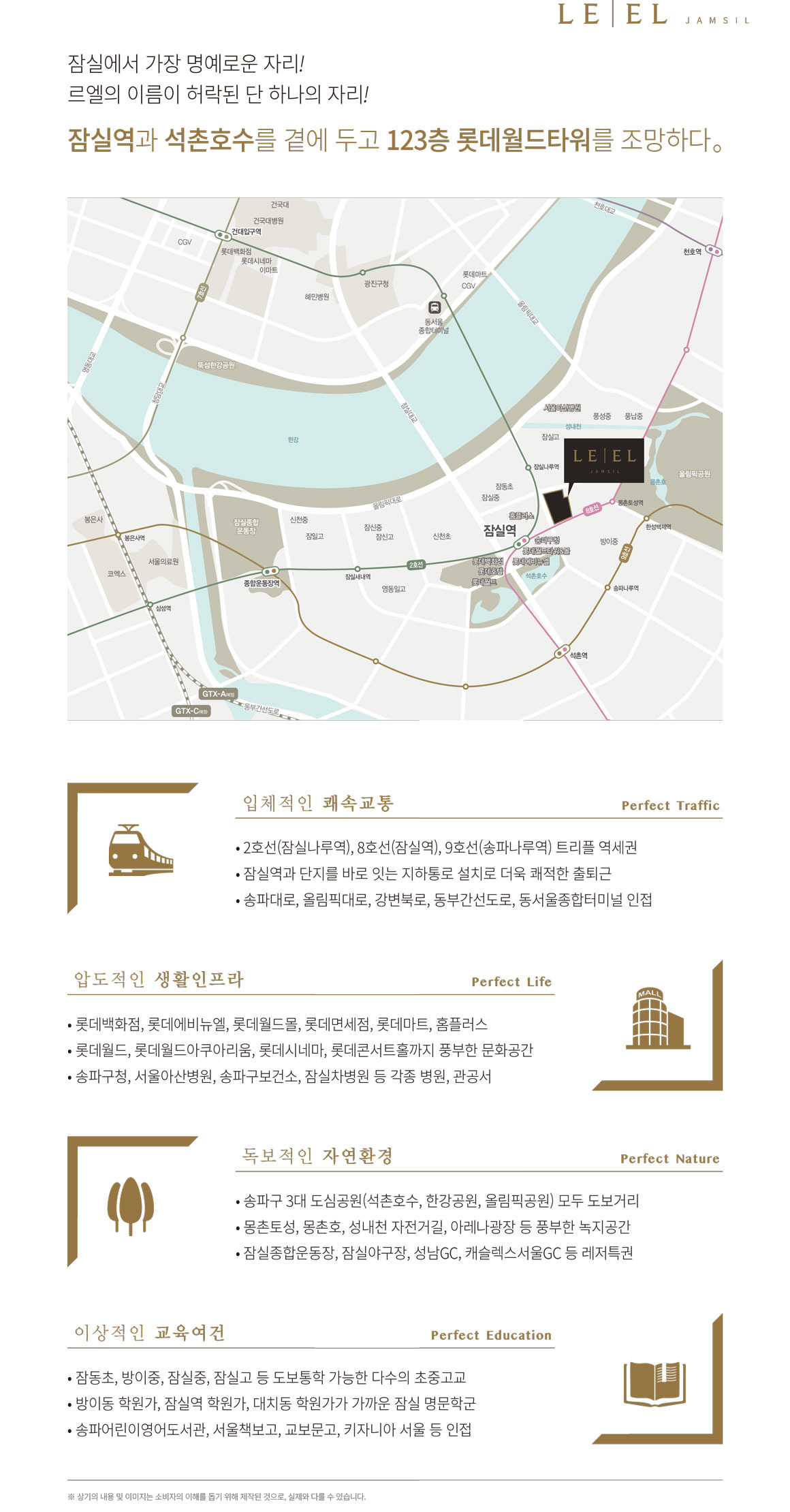 잠실 르엘은 지하철 2호선과 8호선 잠실역이 가깝고 주변에 올림픽공원, 롯데월드몰 등이 있어 편리한 교통과 풍부한 생활 인프라를 갖추고 있습니다. 자전거 도로 및 보행자 도로가 인근에 계획되어 있고, 강변북로, 올림픽대로 등 주요 도로 접근성도 우수합니다. 단지 주변에 대규모 공원이 조성될 예정이며, 대중교통과 차량 이동 모두 뛰어나 실거주 및 투자 모두 매력적인 입지입니다.
