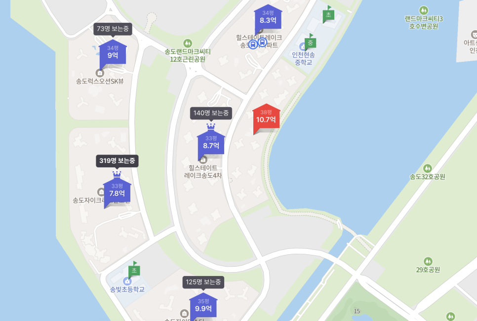 - 대형마트(코스트코·이마트 트레이더스), 송도호수공원, 수변공원 위치