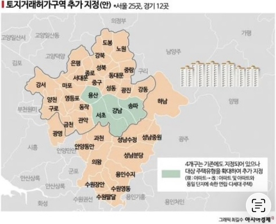 또한 10월 20일부터 같은 지역이 토지거래허가구역으로 지정되어, 아파트뿐 아니라 연립·다세대까지 거래 제한이 적용됩니다.